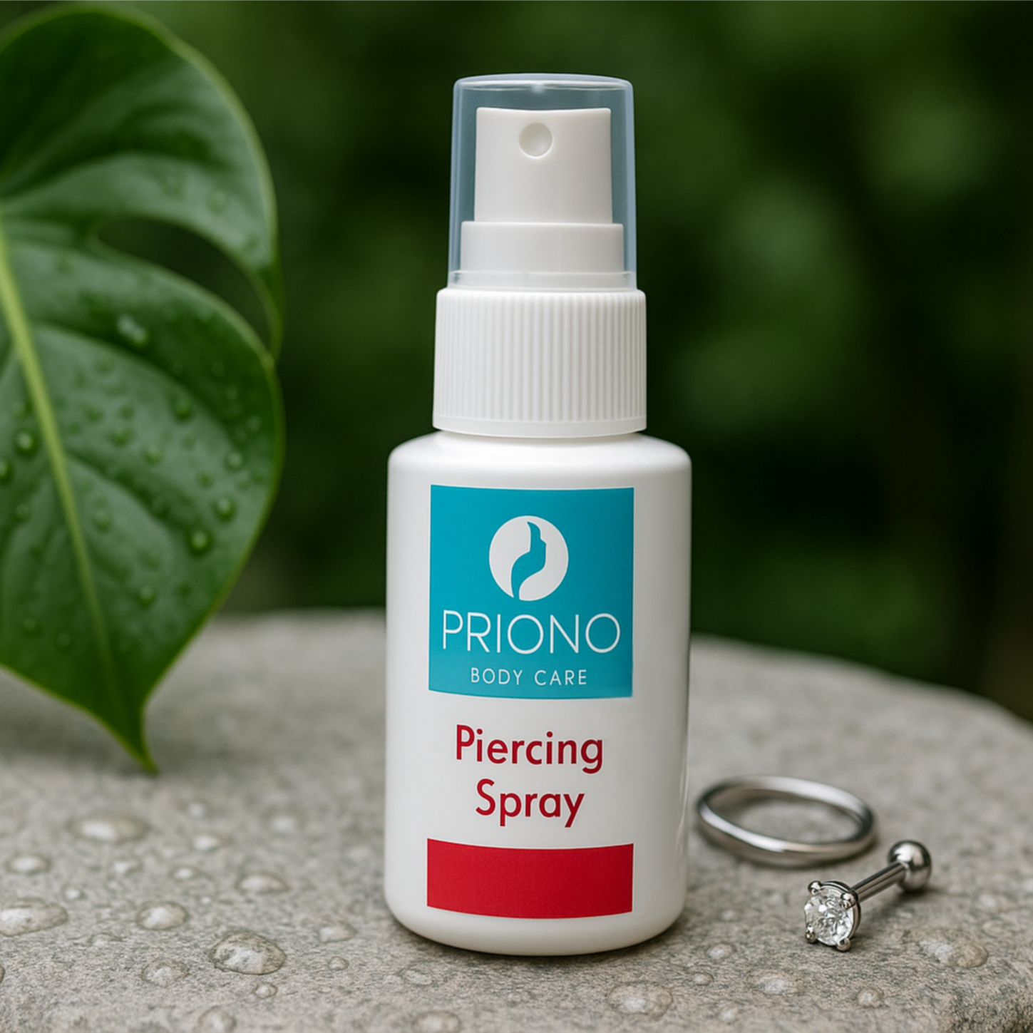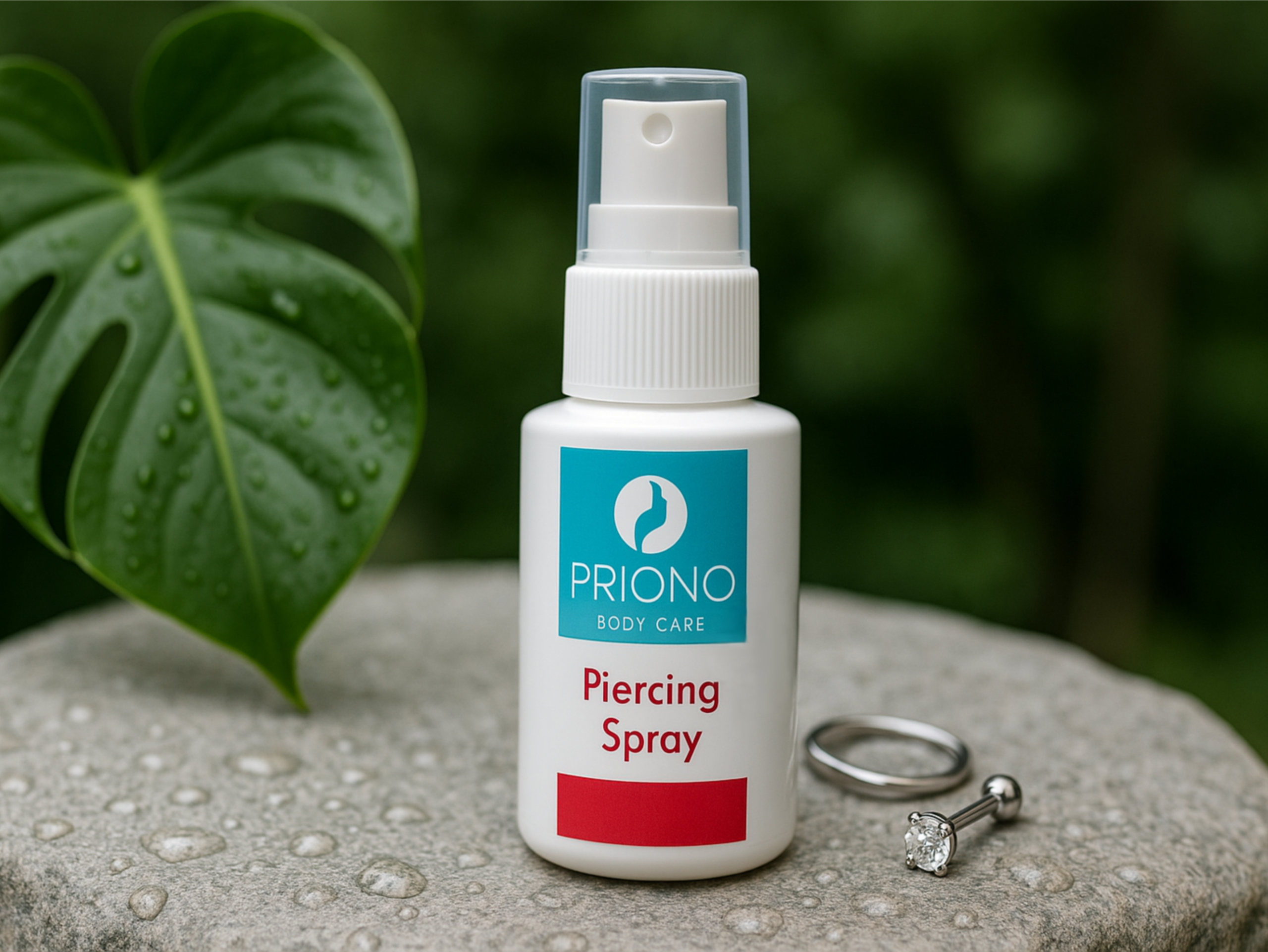 - Reinige die Stelle 3-mal taglich mit dem Priono Piercing Spray. Sprühe das Produkt direkt auf die betroffene Stelle und lasse es kurz